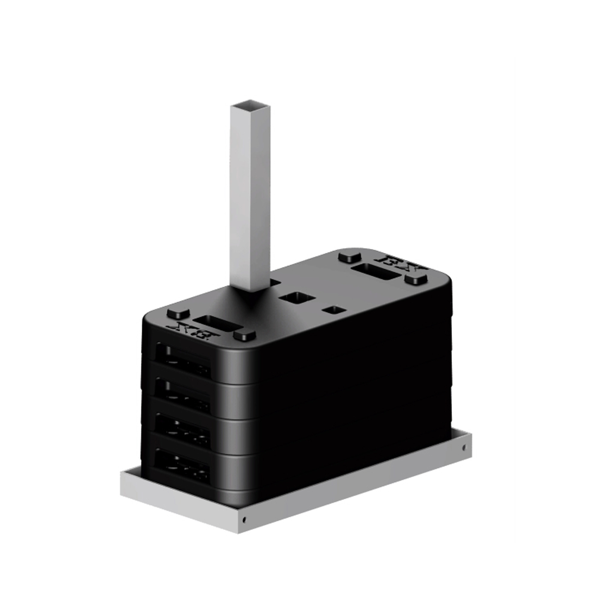 En riktigt stabil stolpfot som byggs ihop för hand, inga delar väger mer än 25kg. Basen består av en galvad stålram med fotstöd för ökad vindstabilitet. Batteriet monteras i 3 st ihåliga belastningar och döljs sedan med en stolpfot som fungerar som lock. Allt kablage är dolt inne i det 1,7 m långa stolpröret.