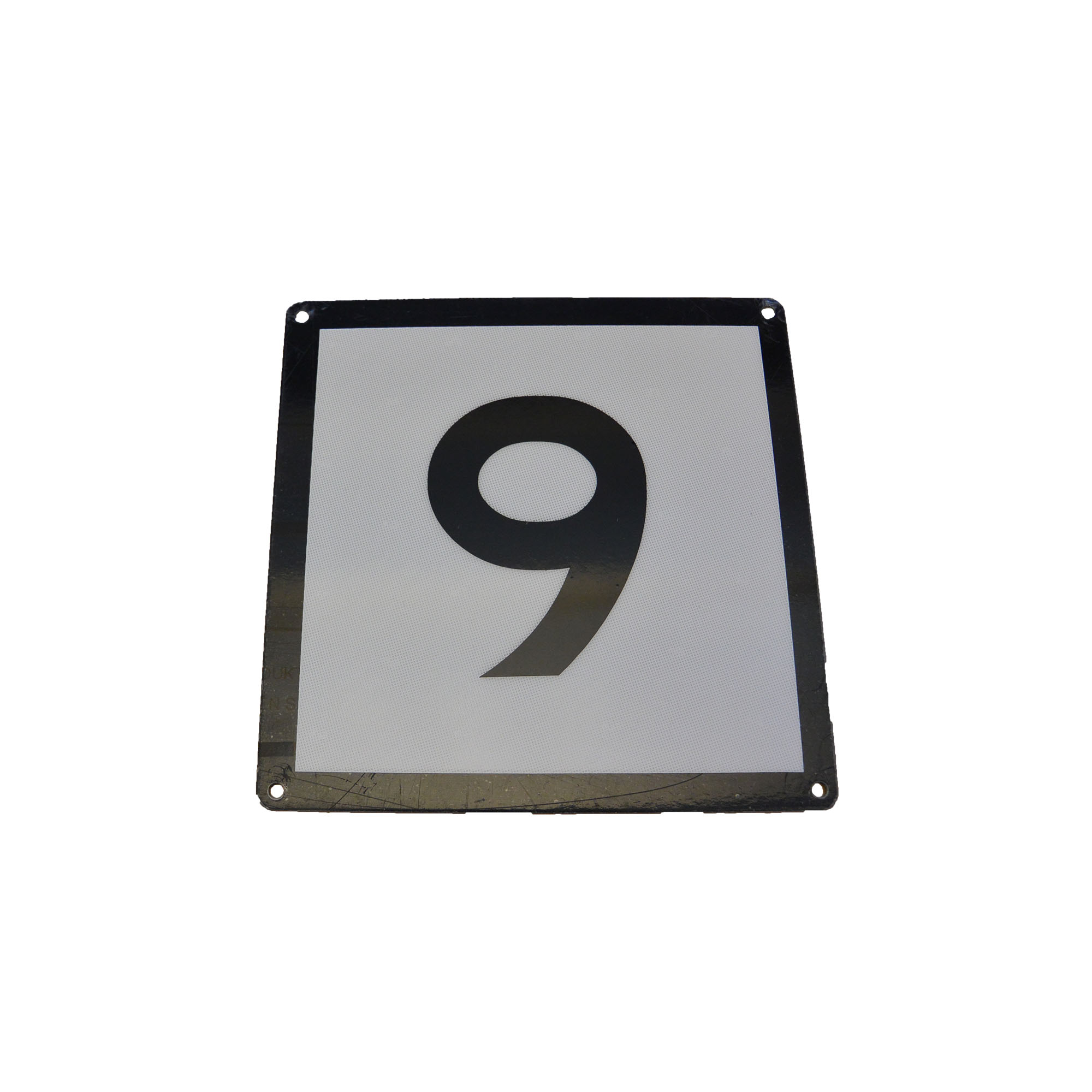 Husnummerskylt tillverkad av 2 mm plan aluminiumplåt med normalreflex. 1 valfri siffra.