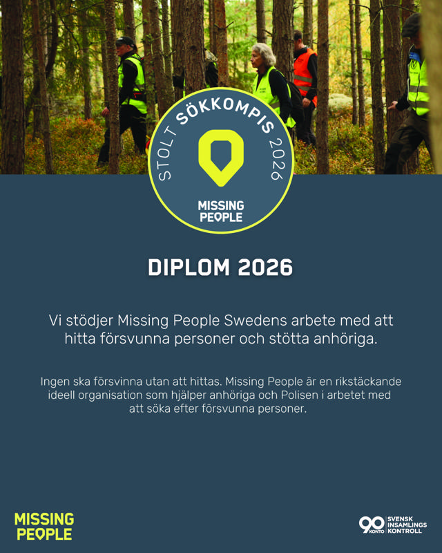 Vi stöttar Missing People och deras volontärer för oss att bidra till ett tryggare samhälle och i arbetet med att hitta försvunna människor.