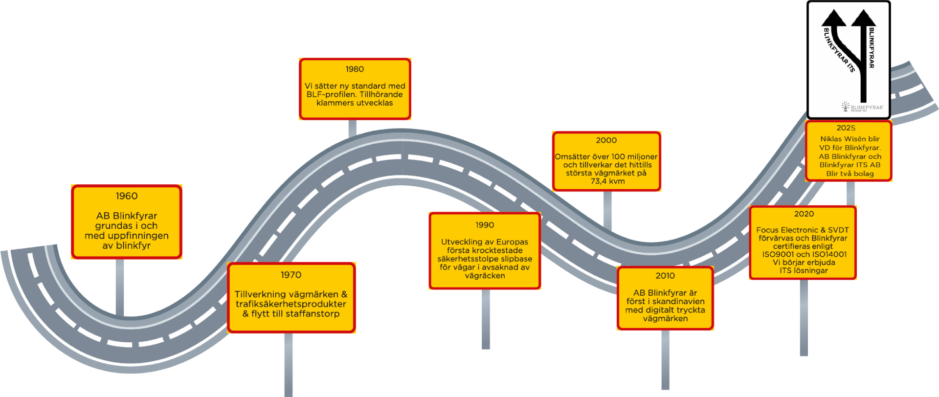 Blinkfyrar började sin resa med en liten fyr. År 1960 importerade lantbrukaren Lars Olsson en blinkfyr från Tyskland som skulle öka säkerheten på väg för bilister. Blinkfyren kom så småningom att bli ersatt med det som vi idag kallar Svensktoppen, en skylt- och brädbärare tillverkad i slagtåligt plastmaterial och med möjligheten att montera en nyare modell av blinkfyr. Svensktoppen är idag en klassisk produkt i Blinkfyrars sortiment som fortfarande flitigt används vid vägavstängning och vägarbeten.