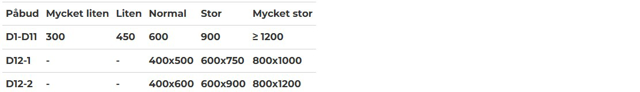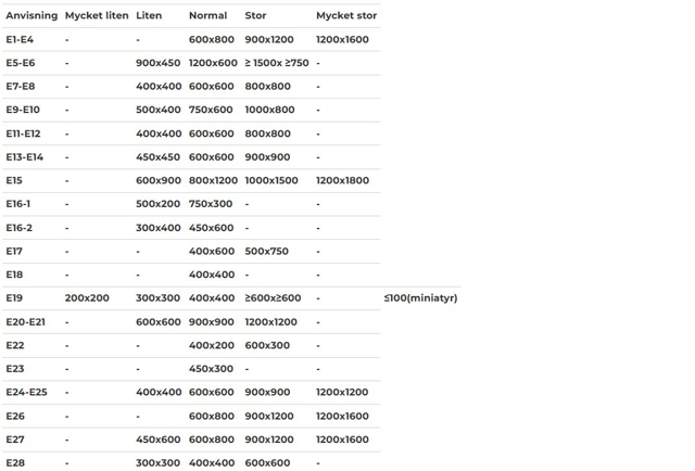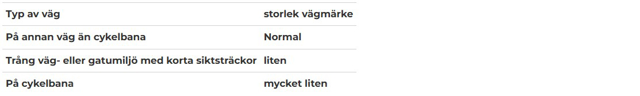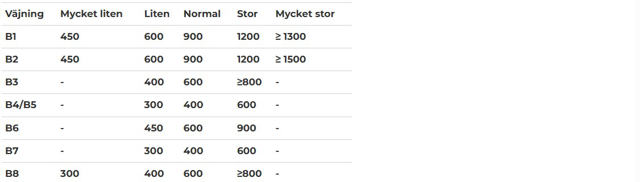 Se nedan tabell för rekommenderade storlekar för olika typer av vägar.