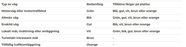 Följande kombinationer av bottenfärg och färger på plattor är tillåtna. Med plattor avses ytor som är infogade i ett vägmärke och som har en annan färg än märkets bottenfärg.